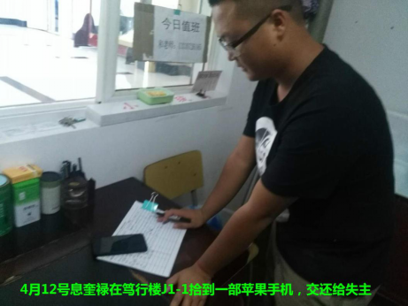 4月12号下午,西苑笃行楼值班人员息奎禄在巡逻过程中,发现笃行楼J1-1教室有一部苹果手机。经过多方了解是交汽学院一名学生开会时遗失的,考虑到失主丢失手机的焦急心情,他立即向上级负责人作了汇报,并等待失主来值班室认领失物。