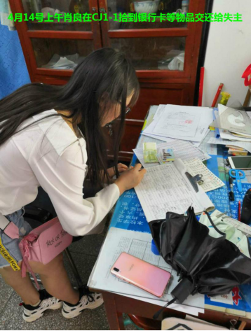 4月14号上午,值班人员肖良在C区主楼多媒体CJ1-1教室巡逻时,拾到身份证、银行卡、饭卡等物品,他第一时间将这些失物交还给丢失的同学。