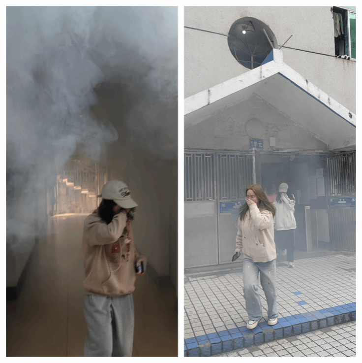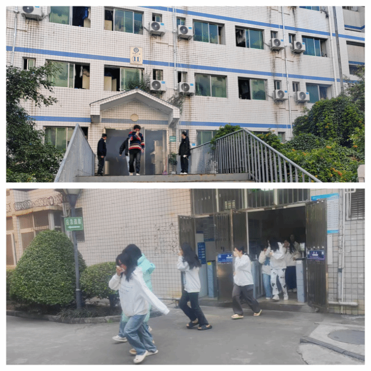 下午14:40,模拟警报响起,演练正式开始。公寓管理人员迅速启动火灾报警、切断电源并模拟报警。各楼栋志愿者立即就位,引导学生用湿毛巾捂住口鼻,弯腰沿指定路线快速、有序撤离。重点模拟起火的柱兴楼(6号公寓)与柱信楼(10号公寓)释放了烟雾,增强了演练的真实性。疏散过程中,关键位置均有人员指挥,防止拥挤,确保安全。全体参与师生在规定时间内疏散至室外指定集结点。