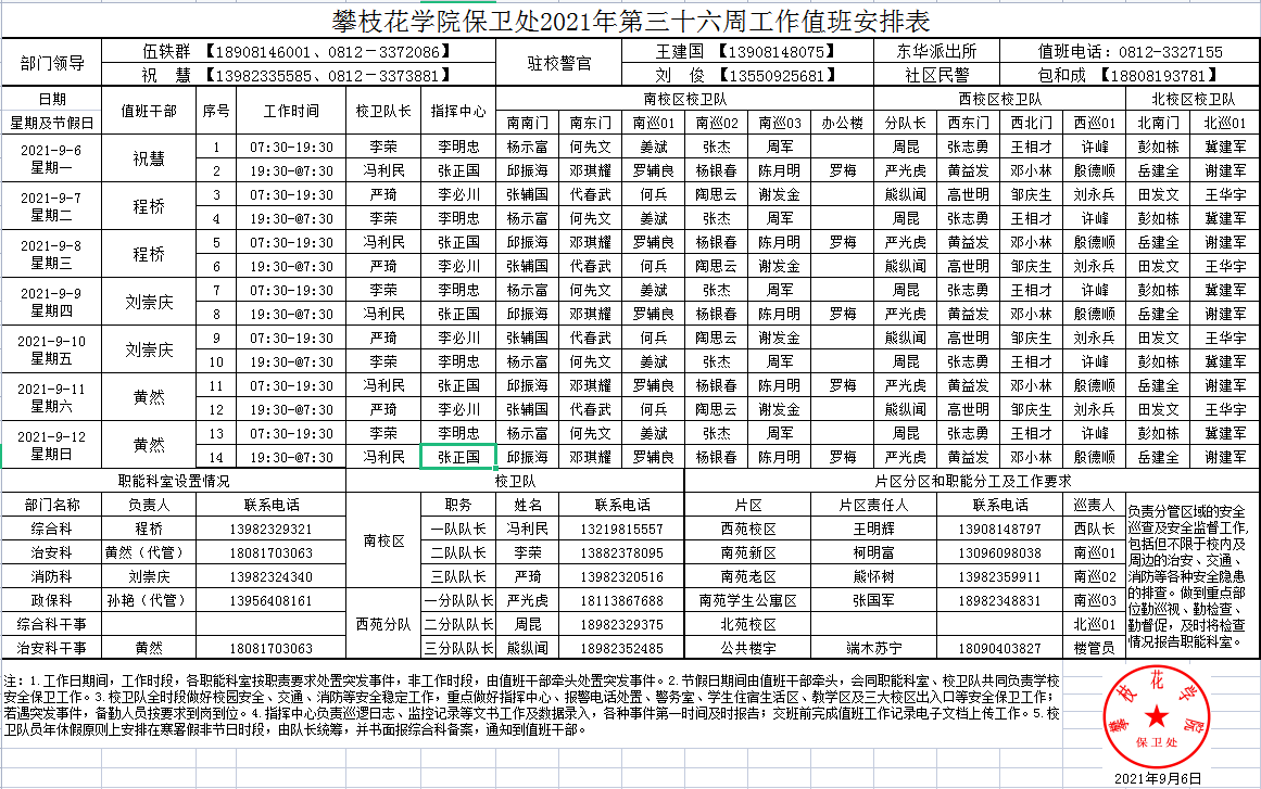 攀枝花学院保卫处2021年第36周工作值班安排表