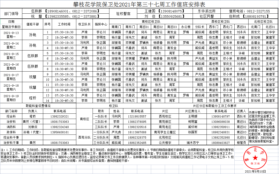 攀枝花学院保卫处2021年第37周工作值班安排