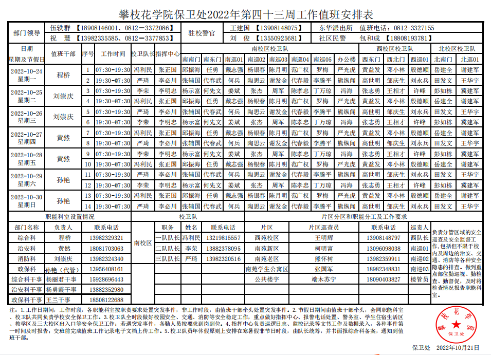 攀枝花学院保卫处2022年第43周工作值班安排