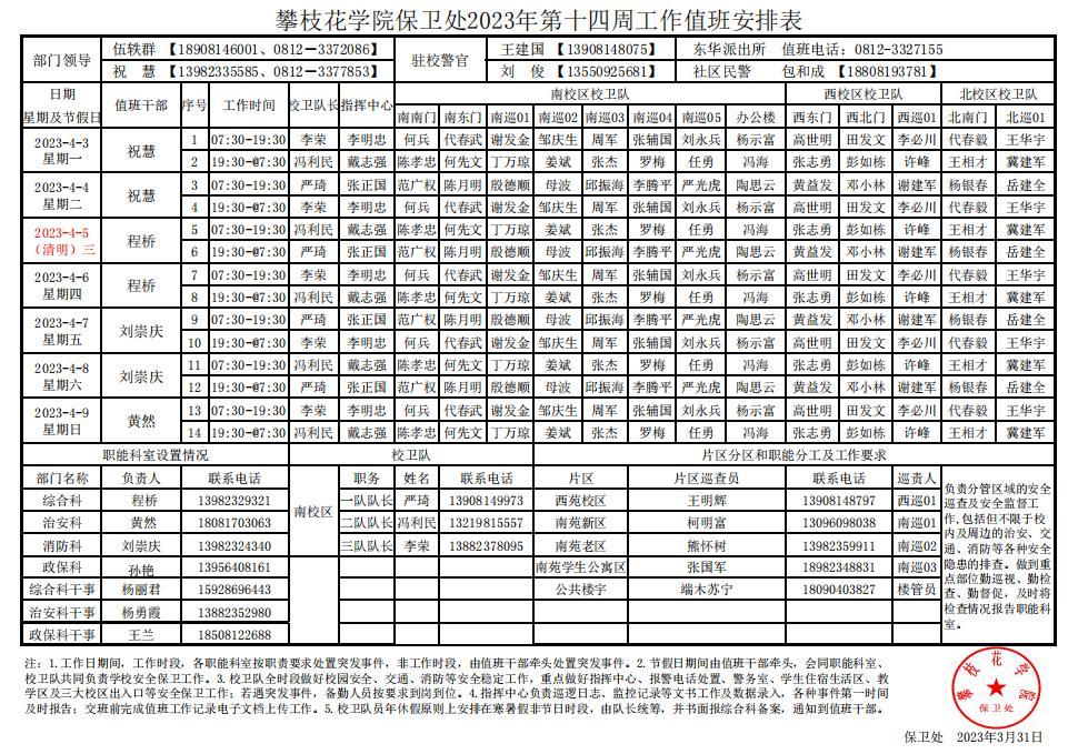 攀枝花学院保卫处2023年第14周工作值班安排