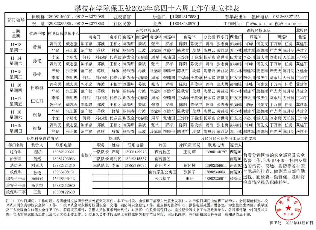 攀枝花学院保卫处2023年第46周工作值班安排