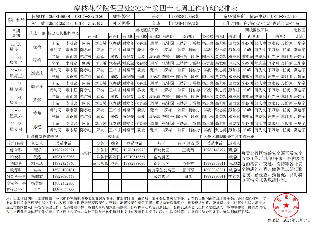 攀枝花学院保卫处2023年第47周工作值班安排
