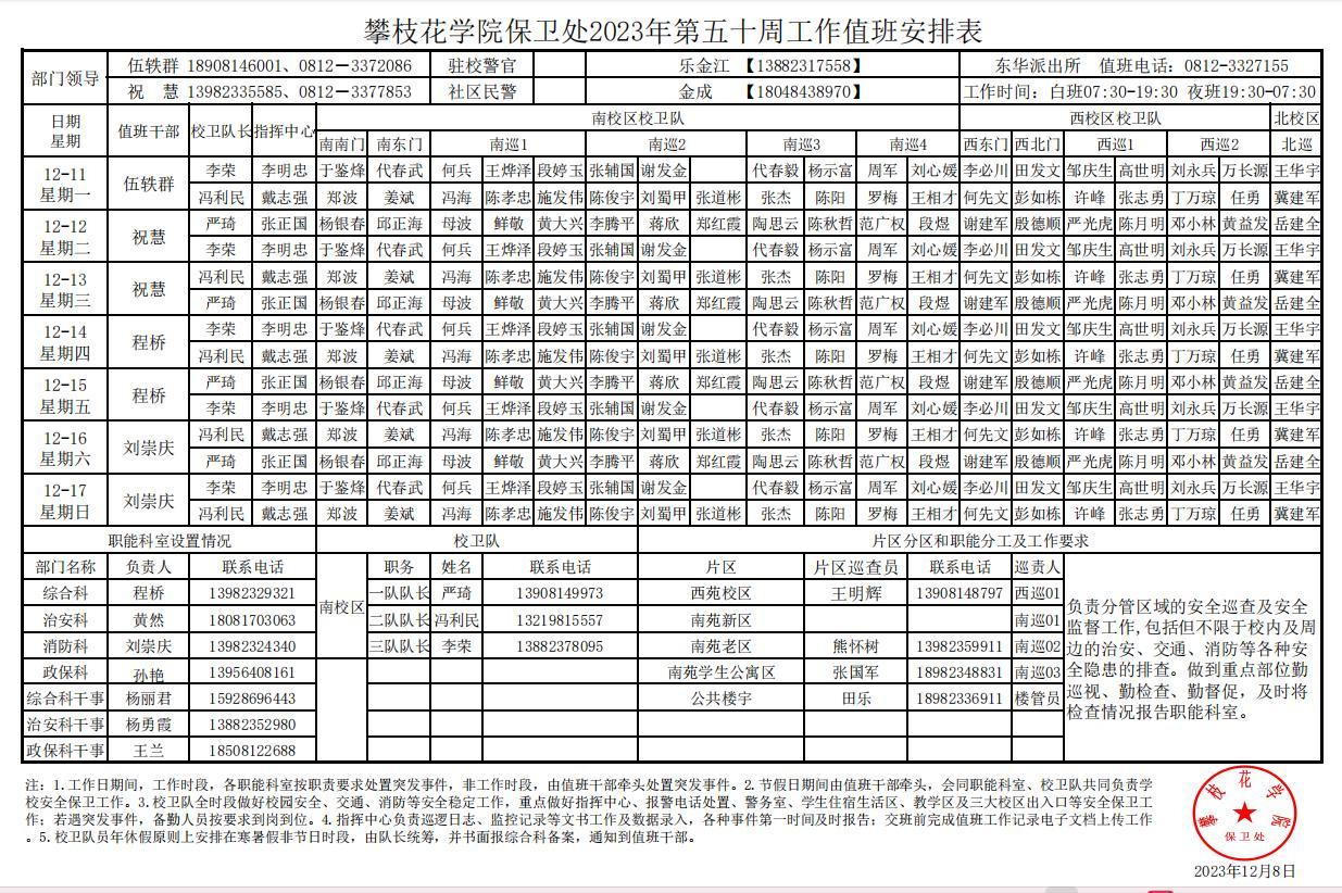 攀枝花学院保卫处2023年第50周工作值班安排