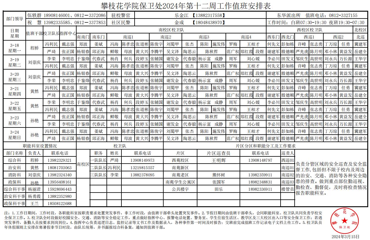 攀枝花学院保卫处2024年第12周工作值班安排
