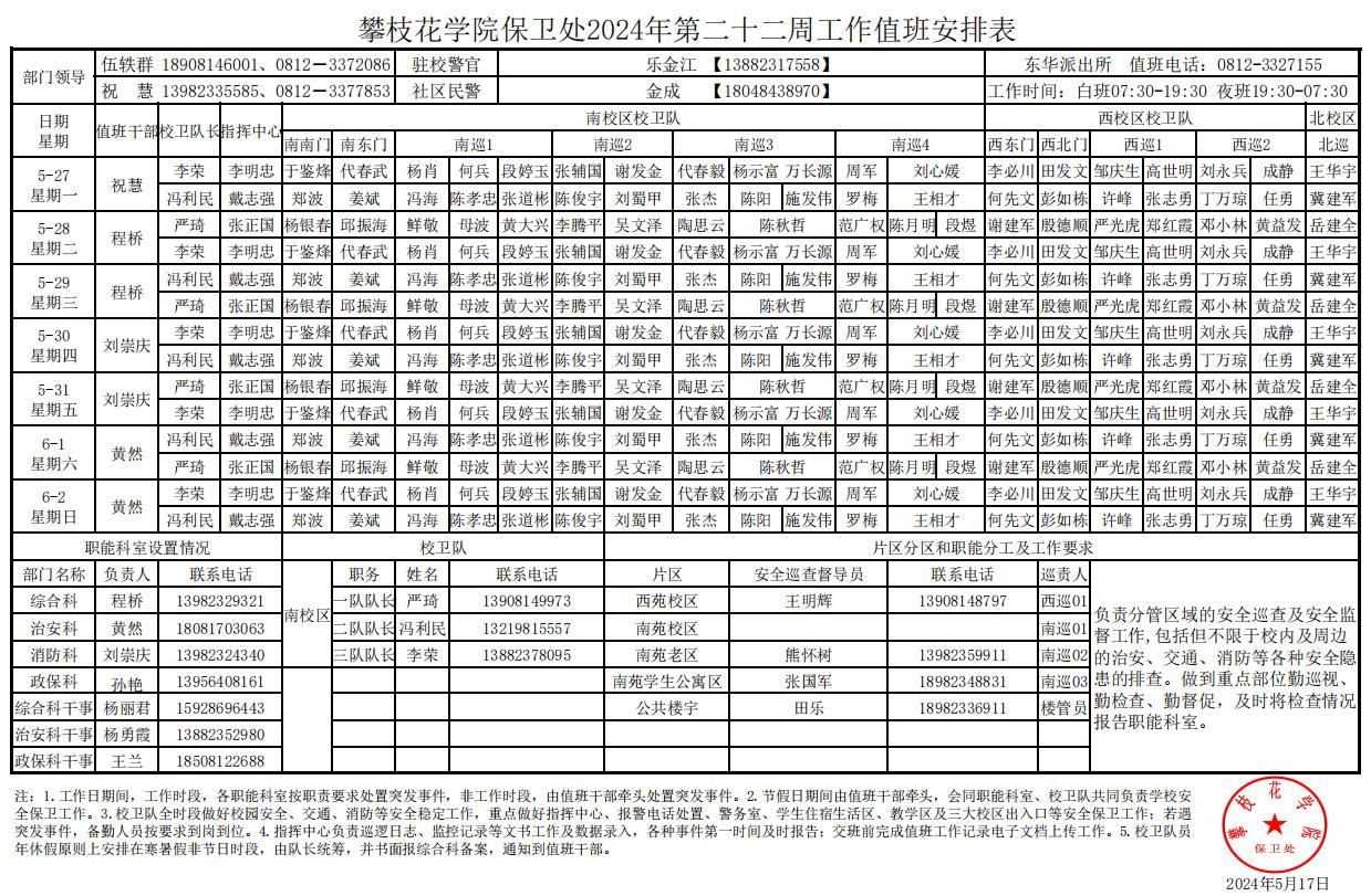 攀枝花学院保卫处2024年第22周工作值班安排
