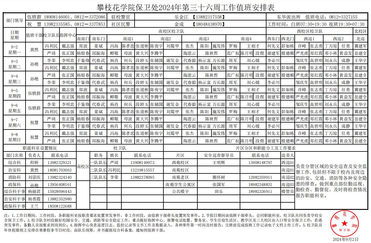 攀枝花学院保卫处2024年第36周工作值班安排