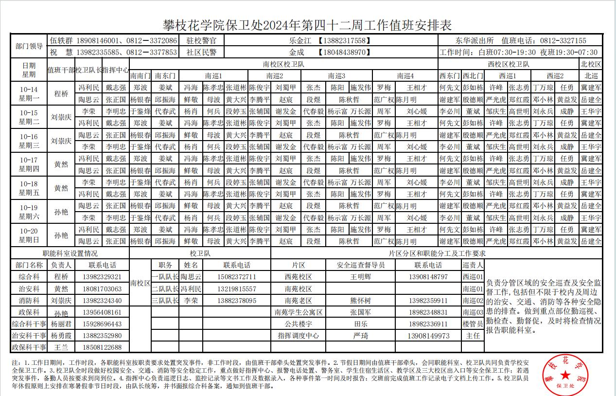 攀枝花学院保卫处2024年第42周工作值班安排