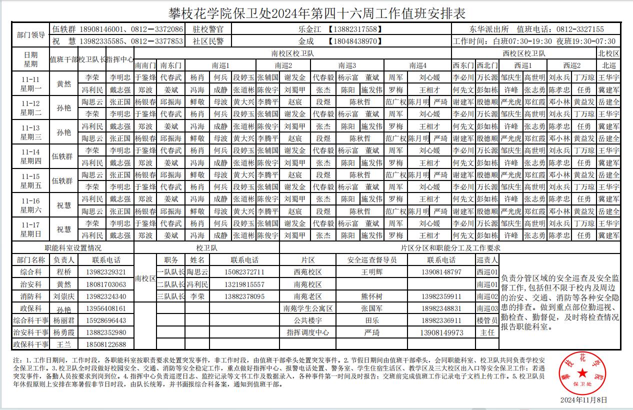 攀枝花学院保卫处2024年第46周工作值班安排