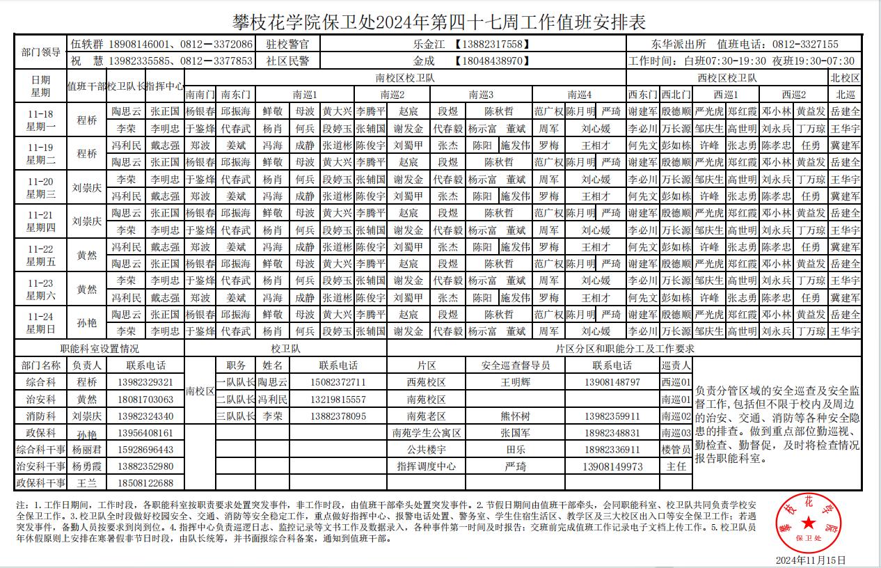 攀枝花学院保卫处2024年第47周工作值班安排