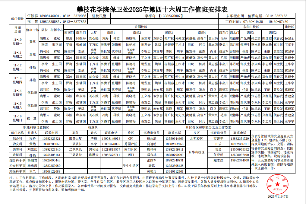 攀枝花学院保卫处2025年第46周工作值班安排